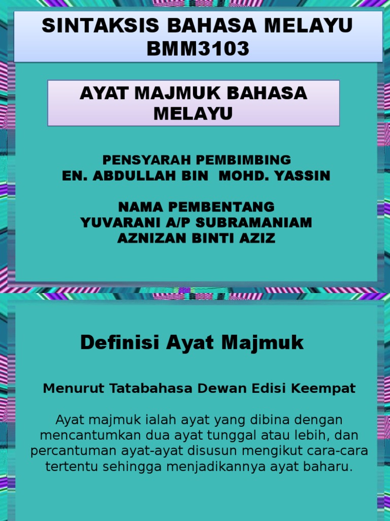 Dan ayat majmuk berbilang subjek. Ayat majmuk komplemen ini terdiri daripada komplemen frasa nama subjek dan komplemen frasa nama objek Jenis ayat majmuk komplemen frasa nama Contoh Ayat majmuk komplemen frasa nama subjek Bahawa mereka keluarganya memang betul. MODUL PEMBELAJARAN TATABAHASA PEDAGOGI MENENGAH RENDAH.